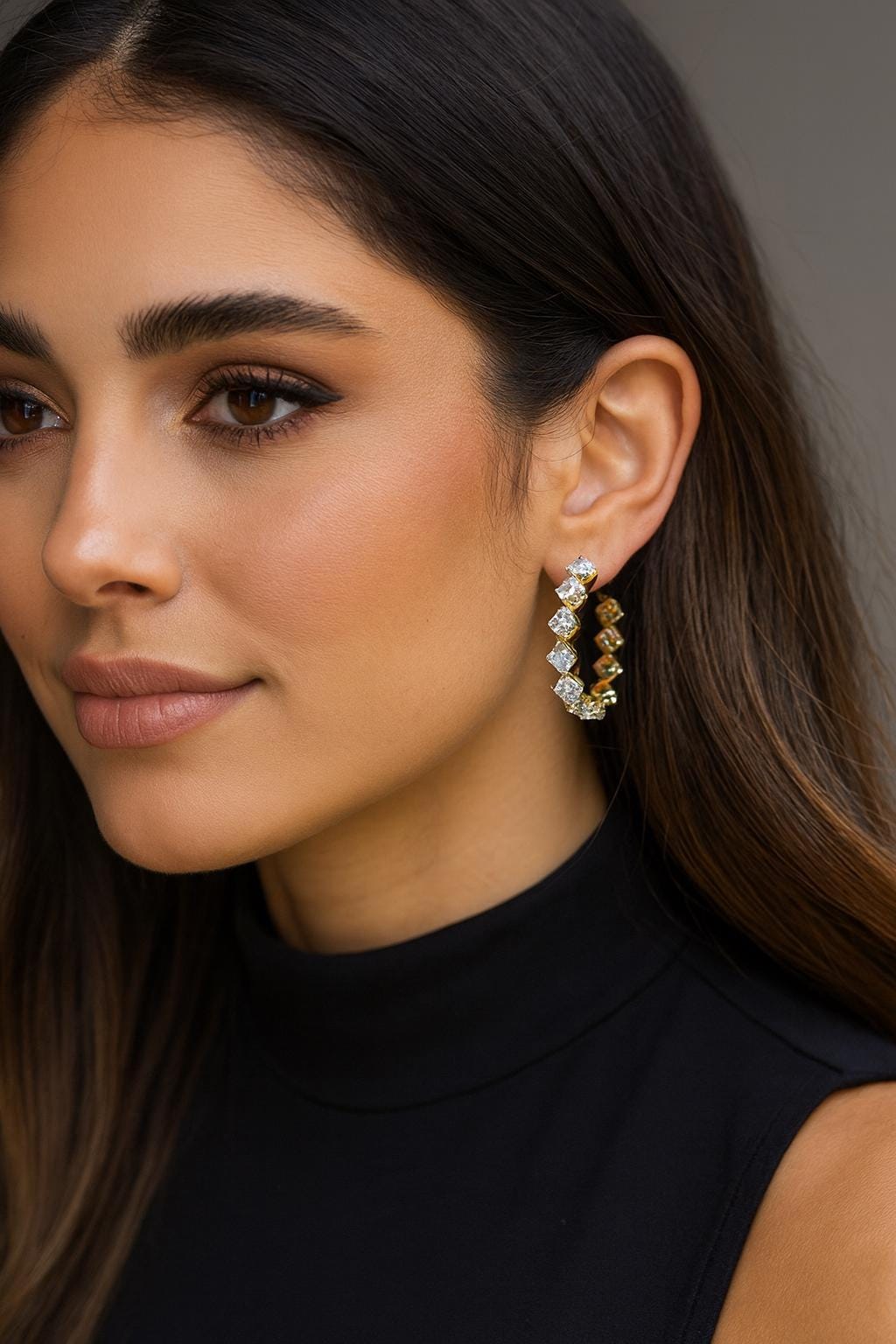 Designed for the woman who loves timeless sparkle, these chic hoops are crafted from 14K yellow gold-plated brass and set with brilliant cubic zirconia stones that capture light beautifully. Perfect for gifting or as a little luxury for yourself.