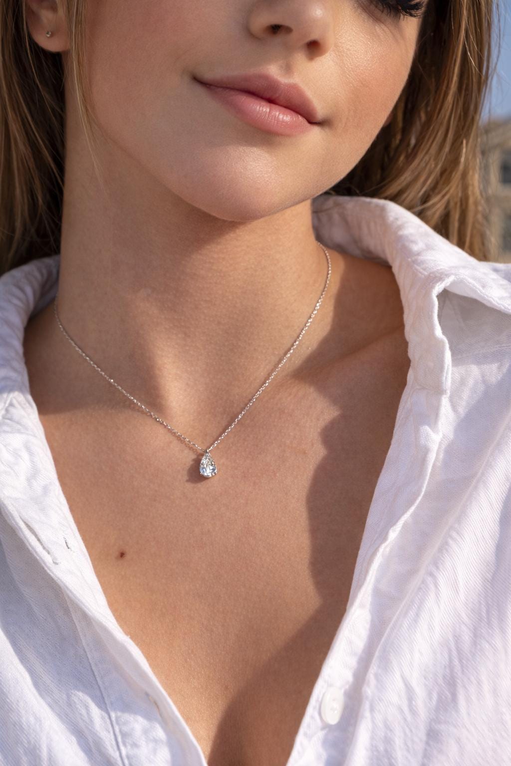 Brilliant sparkle. Elevated elegance. The Riley Teardrop Pendant Necklace now features a luminous 1 carat pear-cut Moissanite stone, designed to rival the fire and brilliance of a natural diamond. Timeless, refined, and effortlessly luxurious, Riley is the kind of piece you’ll treasure forever.