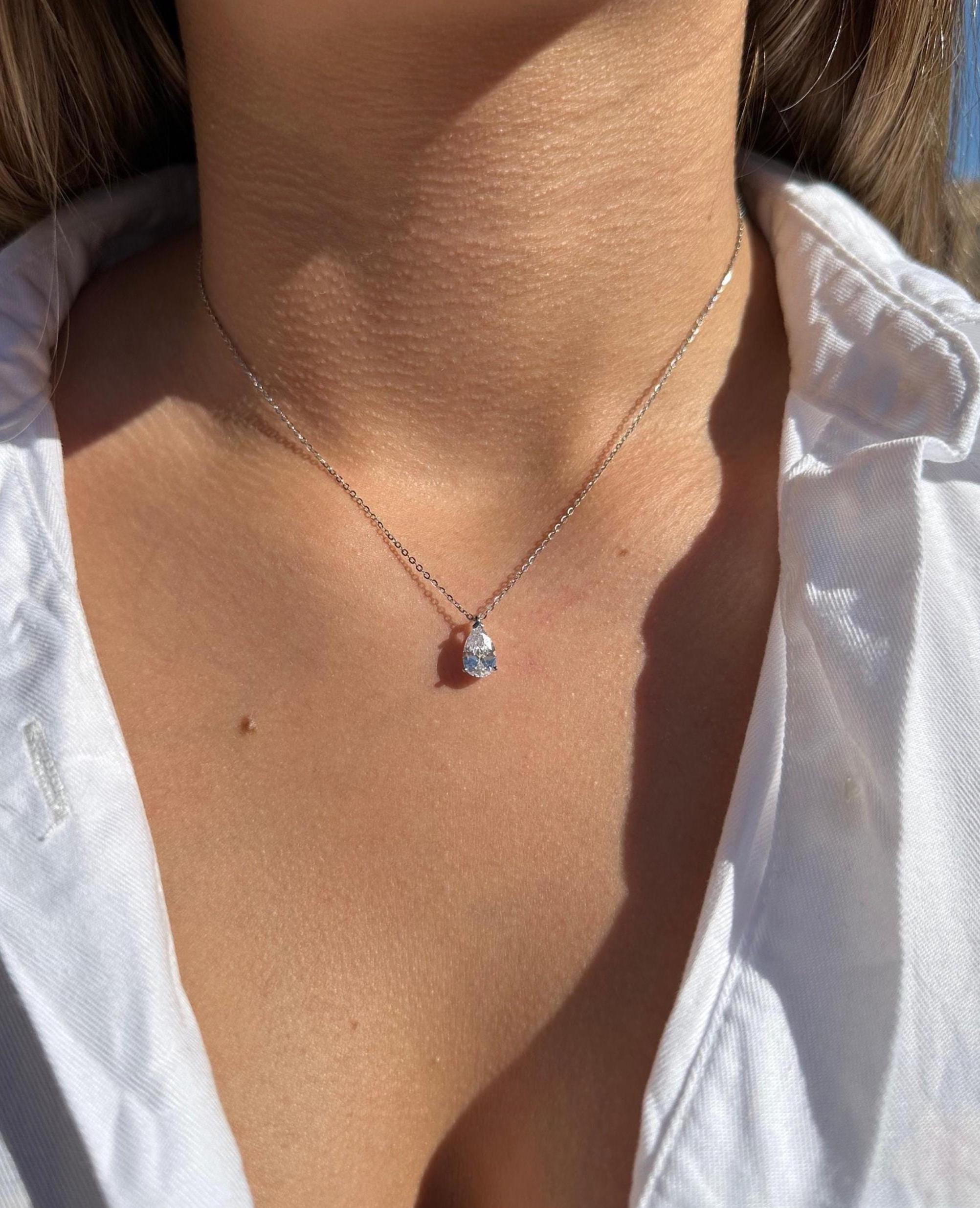 Absolutely beautiful necklace. The teardrop shape is the perfect size, not too big and not too small. The stone is absolutely stunning and shiny. I plan on wearing this necklace for my wedding and cannot wait!