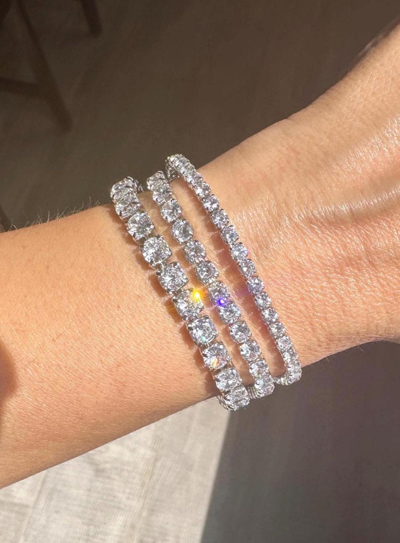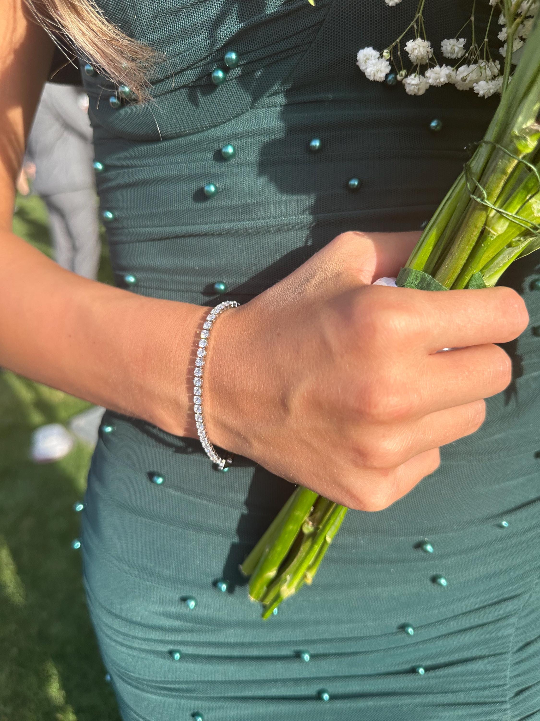 Shimmer and shine every day with our Bestie Tennis Bracelet. Featuring brilliant round AAA cubic zirconia stones set in white gold plated brass, this timeless piece delivers the perfect mix of elegance and sparkle.