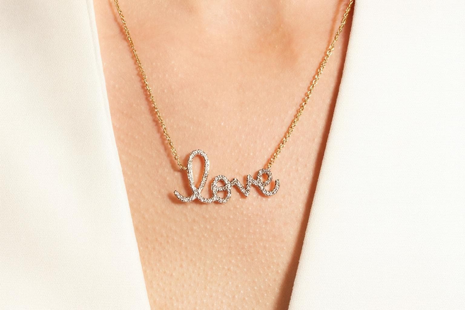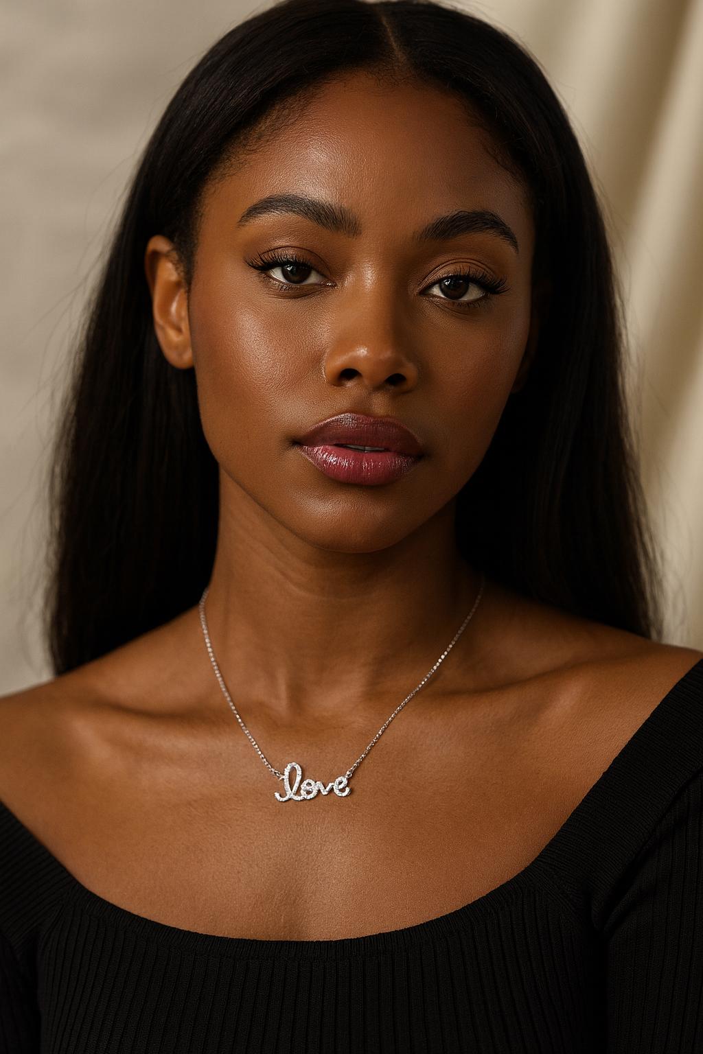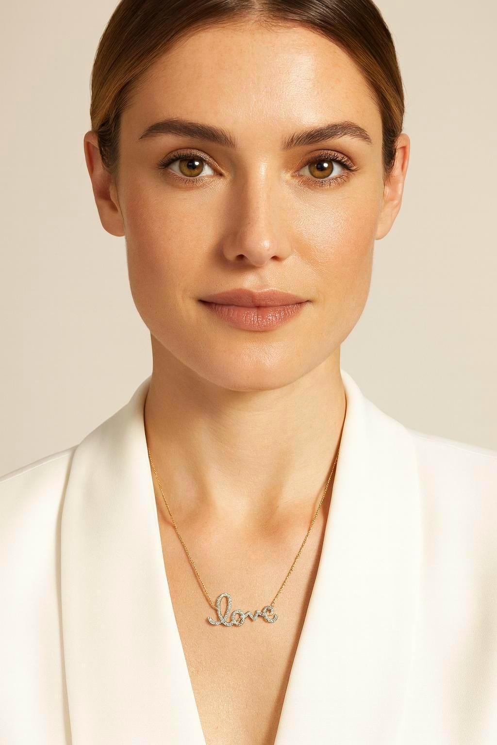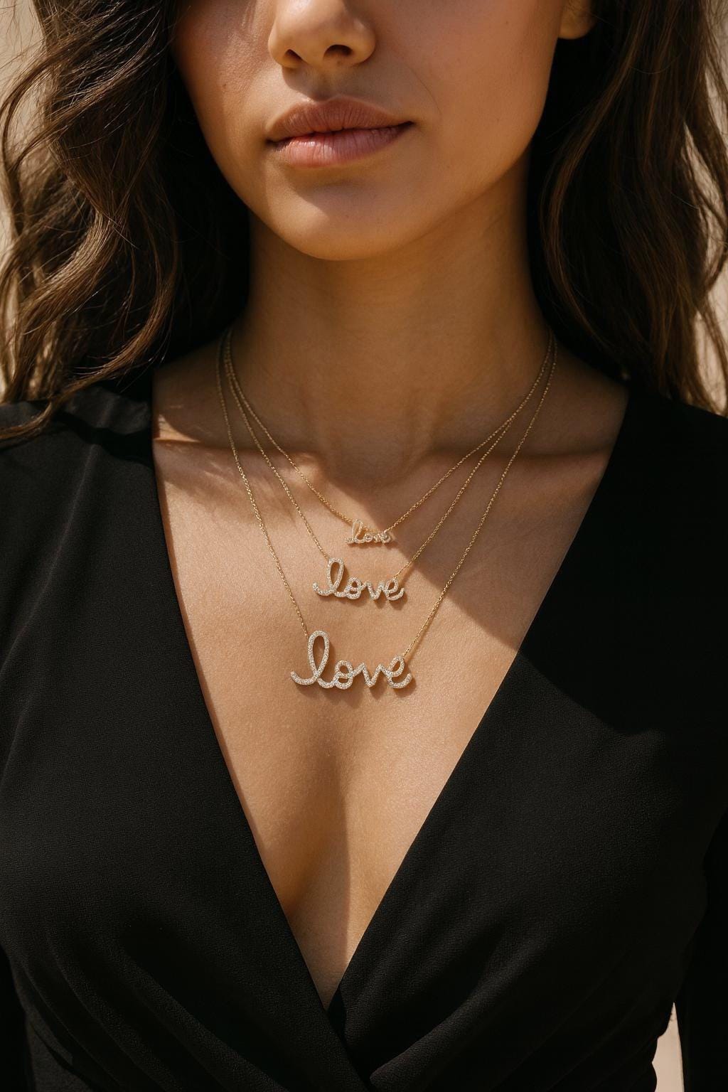 The Diamond Pavé Love Necklace spells out the word “love” in elegant script, accented with shimmering simulated diamonds for a timeless, meaningful look. Available in three sizes to suit your style: