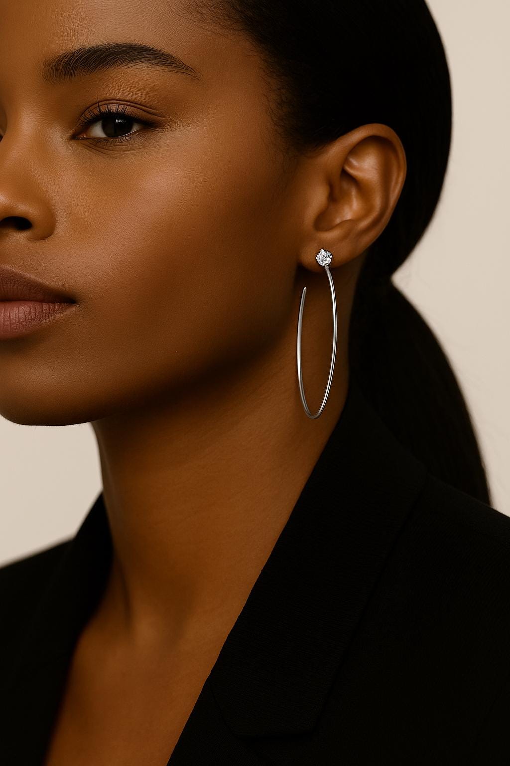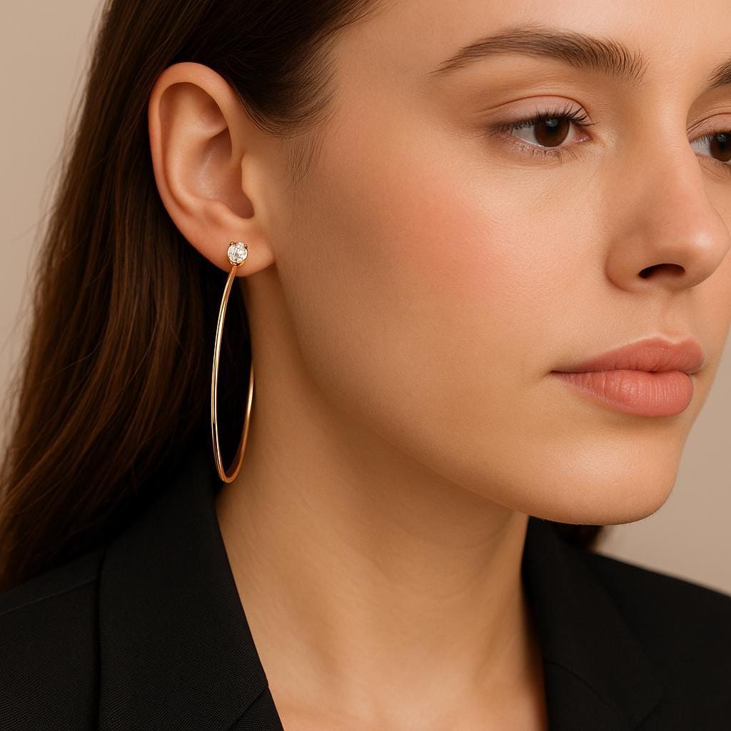 Made to Order Diamond Solitaire Hoop Earrings crafted in 14K white or 14K yellow gold plated 925 Sterling Silver, these stunning hoops feature a brilliant round-cut Moissanite diamond stud (0.25ct each). Equal parts modern edge and timeless classic, these hoops embody elegance and sophistication. The understated staple that everyone needs in their wardrobe.
