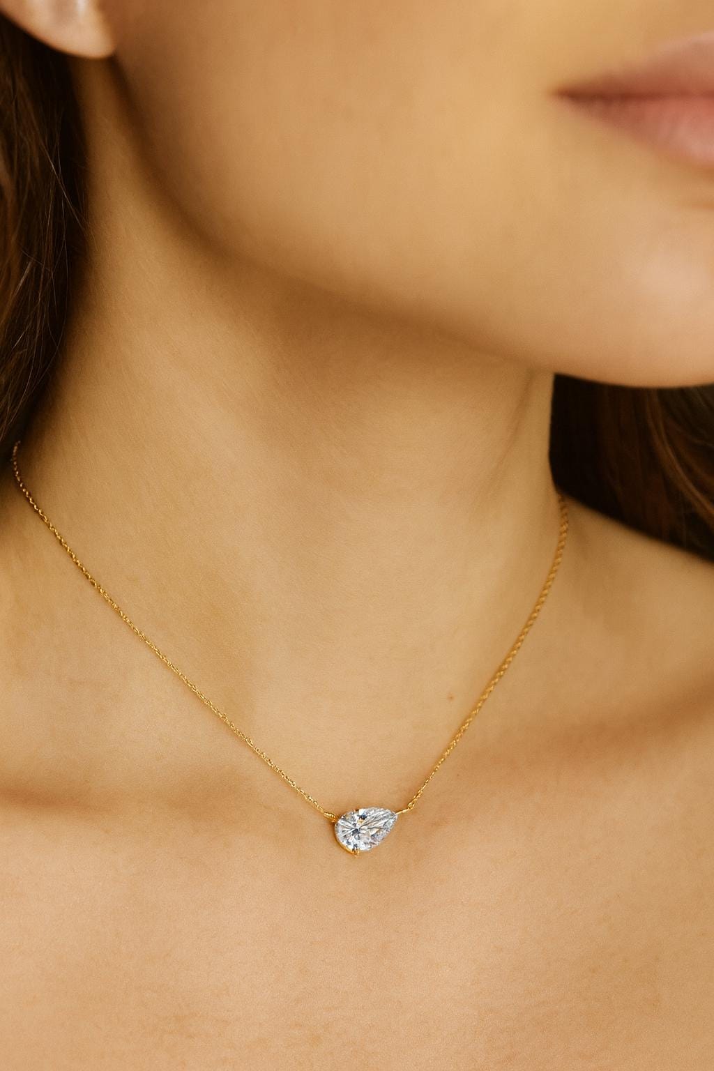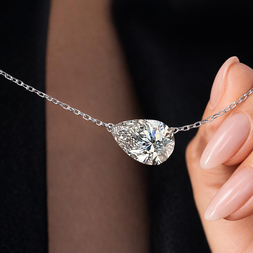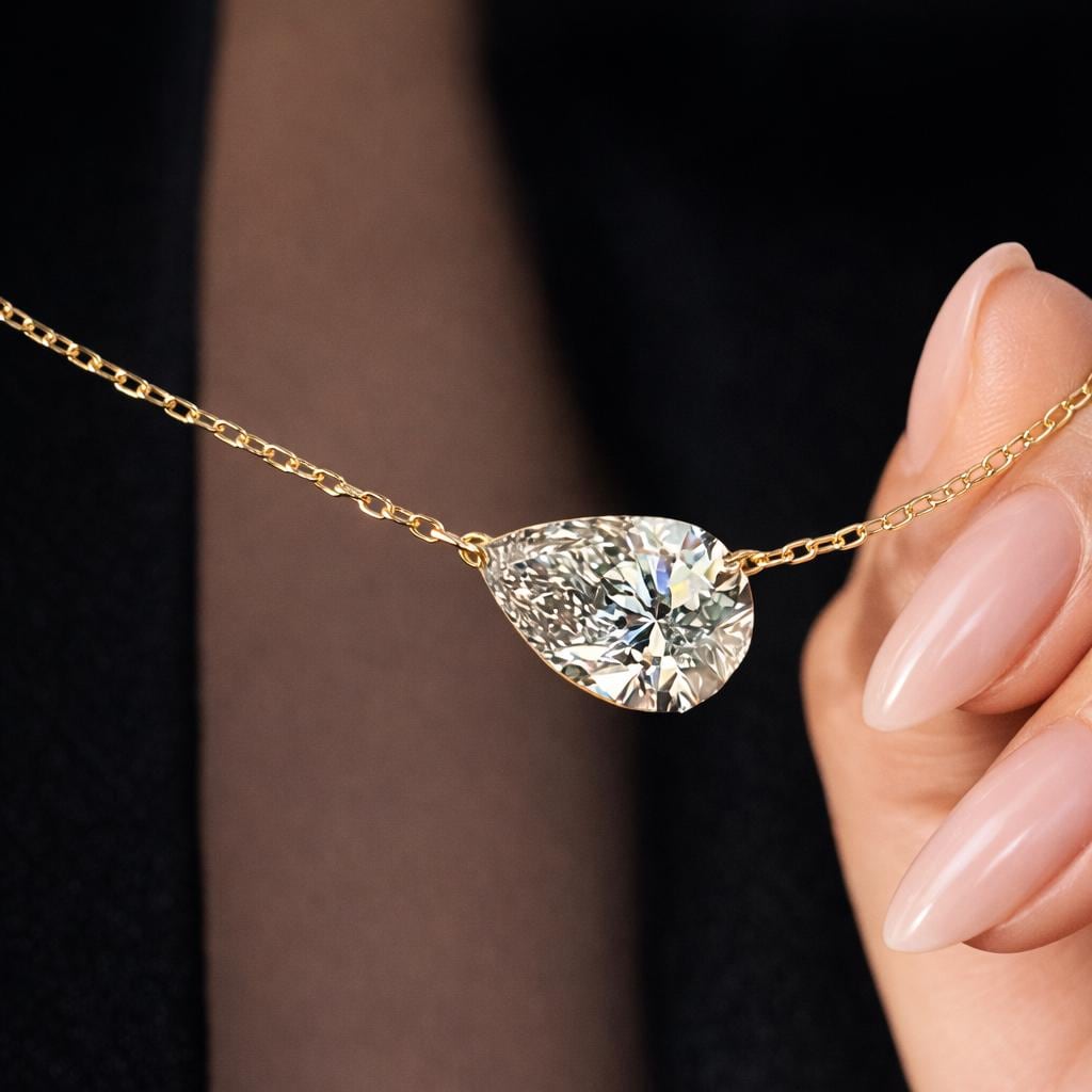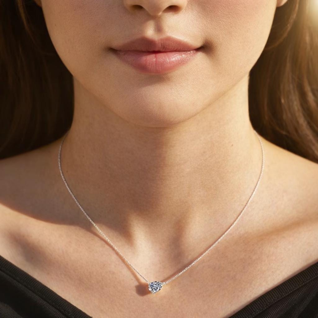 East-West pear cut diamond necklace with elegant sparkle and a modern twist. The Elara necklace features a brilliant pear-shaped stone set horizontally for a refined, contemporary look that feels both delicate and luxurious. Designed to mimic the fire and clarity of a natural diamond, this piece delivers stunning brilliance without the luxury markup.