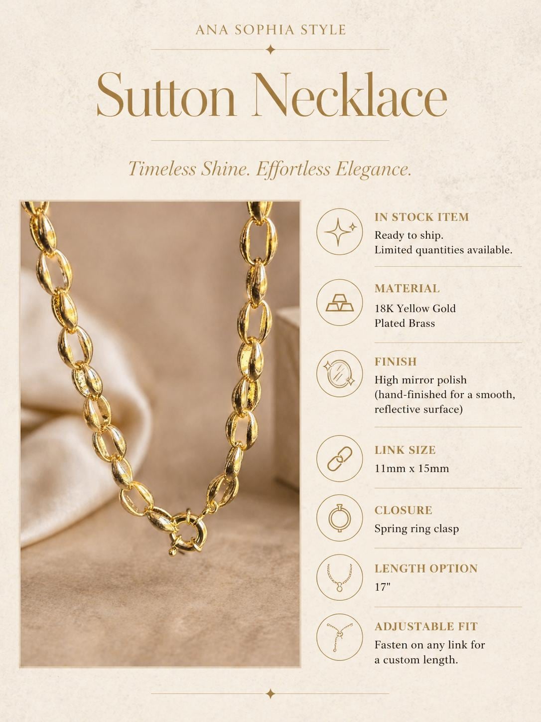The Sutton Statement Necklace is designed to stand out — featuring oversized oval links with a high-polish, mirror-like finish that reflects light beautifully from every angle.